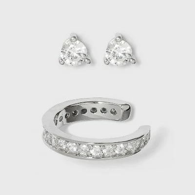 Complete your look with a shiny touch when you wear the Sterling Silver Round Cubic Zirconia Stud and Ear Cuff Set from A New Dayโข. This earring set features two silver studs with cubic zirconia and a silver ear cuff lined with cubic zirconia for a bright look youโll love. Post back closure on the studs helps keep them firmly in place, while you can slip the ear cuff over your ear for easy on and off. Made from sterling silver and nickel-free metal, this set accommodates most skin types.