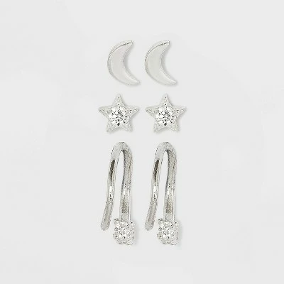 Bring current fashion to your jewelry box with this 3-Piece Sterling Silver Star Stud Cubic Zirconia Moon and Endless Hoop Earring Set from A New Dayโข. This set features three silver-finished pieces, including a pair of moon and star-shaped earrings for a sweet, feminine look. The star is studded with cubic zirconia for an elegant design that sparkles in the light โ just like stars in the night sky. The hoop earrings end in matching cubic zirconia pendants in a rectangular shape. These unique pieces are great on their own or paired together. Their post back closures offer you easy on-and-off wear, and the nickel-free construction makes them suitable for most skin types.