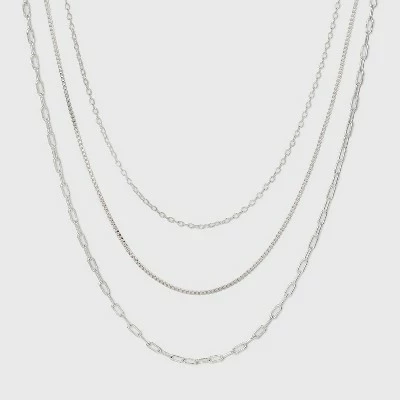 Simple yet stylish, this 3-Piece Plated Cable Box and Paperclip Chain Necklace Set from A New Dayโข helps you create an elevated look any day. This three-piece necklace set features sleek chains of varying designs to help you style different looks each day. Great to wear alone or mix and match with other accessories, this silver-tone necklace set helps you create a stunning look no matter the occasion.