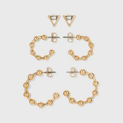 Glam up your jewelry collection with the Stud and Ball Hoop Earrings from A New Day™. Made with lightweight, nickel-free metal in a gold finish, this earring set includes three pairs in two different designs — there’s a triangular stud pair accented with a rectangular clear crystal at the top, and two pairs of open-hoop earrings in graduated sizes that are dotted with golden balls for extra glam. Bring elegant shine to your casualwear and night-out looks with this set of gleaming stud and hoop earrings.