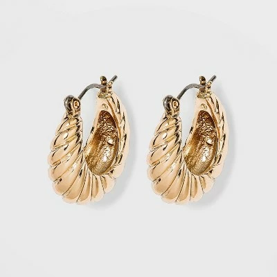 Elevate any of your looks with these Gold Textured Small Hoop Earrings from A New Day™. These small huggie hoop earrings in a shiny gold tone finish make a versatile accessory for any occasion. Designed to fit snuggly around you ear, they feature a thick textured design for edgy style. The lightweight earrings are comfortable for all-day wear — they feature butterfly backs for a secure fit, while the nickel free metal construction suits most skin types. Wear this pretty pair with black dresses and heels or with everyday casual looks for a boost of fashion.