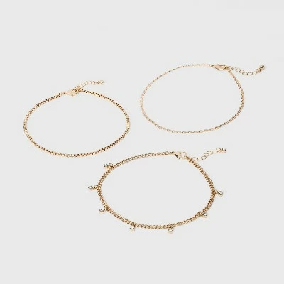Add a little shimmer and shine to your look with the 3-Piece Gem Drop Anklet Set from A New Dayβ’. This anklet set features three different designs β one gold-hue chain with crystal stud details, one chic box chain and one twisted chain β so you can mix and match your styles however you like. Each piece features lobster claw clasp closure to help provide a secure wear. Whether you sport these gold-hue anklets with flats or heels, theyβre sure to brighten any look.