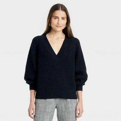 Bring a chic update to your cool-weather closet with this Chunky V-Neck Pullover Sweater from A New Day™. This V-neckline sweater showcases a chunky-knit detailing to lend a bit of structure and definition for a standout look, accompanied by ribbed cuffs for even more polished flair. A lightweight fabric construction keeps you in cozy comfort as you move through the day. Pair with jeans and sneakers for a casual vibe, or style with straight-fit pants and pointed flats for a refined aesthetic.