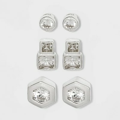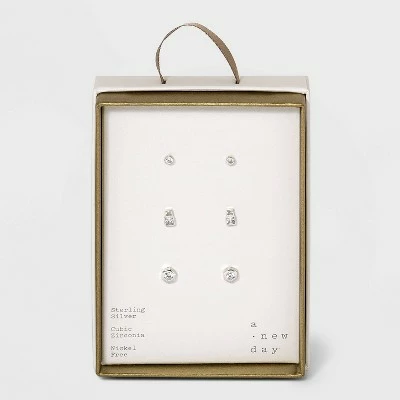 As precious as your loved ones, this Three-Piece Sterling Silver Cubic Zirconia Multi Shape Stud Earring Set from A New Dayโข makes a perfect gift for all occasions. Each pair in this sterling silver earring set has a varying shape and design to help you create a variety of looks each day. Studded with stones, this cubic zirconia earring set adds glamorous appeal to your everyday or occasional outfits. Made with nickel-free metal, this three-pair earring set suits all skin types.