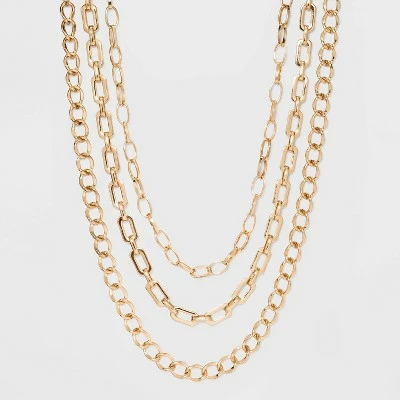 Elevate your look in one fell swoop with the Three-Piece Metal Chain Link Necklace from A New Day™. The multi-strand necklace in gold tone is made of three individual strands of chunky chains in different styles to complete your outfit in statement style. It has a shorter, oval-link chain sitting on the inside of a longer rectangle-link chain, while the outermost chain is made of wavy round links. The three strands of this chunky chain necklace can also be worn separately for a little pared-down effect. Wear the multi-strand look with an evening turtleneck dress, and sport a single strand on your crewneck tee for easy daytime wear.