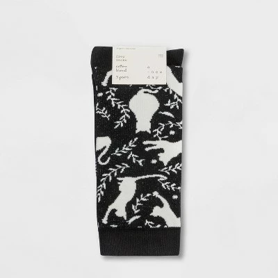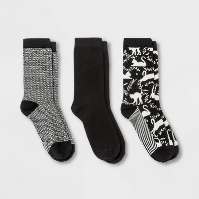 Pamper your feet with the Cat Crew Socks from A New Dayβ’. This pack of socks includes three pairs featuring a playful assortment of designs in a neutral color palette of black and white, which will pair perfectly with a wide variety of boots and sneakers in your wardrobe. You can add a touch of whimsy to your look with the cat and swan print black socks that showcase a striped design on the sole, select the white and black patterned stripes for subtle texture, or choose the solid black pair for a versatile look for many shoes. These crew socks are crafted from a soft and lightweight fabric with a bit of stretch for all-day comfortable and breathable wear, and the rib-knit cuffs lend stay-put comfort for fitting inside your shoes.