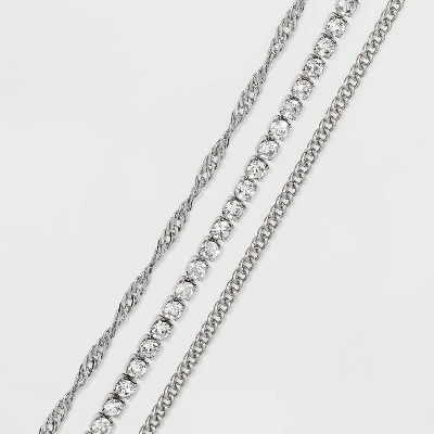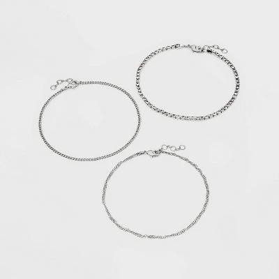Embellish your warmer-weather wardrobe with the Twisted Curb Stone Anklet Set from A New Dayβ’. This set includes three coordinating anklets in a dark silver tone: one with dainty rhinestones, one with simple links and one twisted curb chain. Wear each one solo or layer them together for a unique look that puts the perfect finishing touch on your ensemble, because bracelets arenβt just for wrists.
