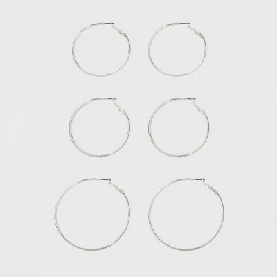 - Pack of 3 different sized hoop earrings in a shiny silver finish