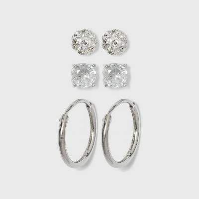 You’ll have everything you need with this Sterling Silver Set of Three Fireball Stud Earrings and Endless Hoop Earrings. The set is the perfect gift for the lady in your life or to fill your jewelry collection for everyday wear. Simple silver settings on the studs are great for timeless style, and they’ll add a little sparkle to your outfit. The simple clear gem studs are great for a simple look, while the all-over small gem look of the rounded studs is great for romantic detail. Small silver hoops add a boho edge to any outfit.
