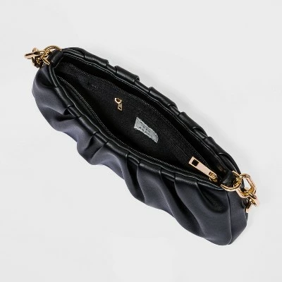 From date night to special occasions, bring on-trend appeal to your look with this Shoulder Bag from A New Day™. This shoulder handbag is designed with a single compartment that opens to reveal an interior zip pocket for stowing your essentials, while the zip closure helps keep the contents from spilling out. Compact in size, it features a removable metal chain-link strap for easily slinging over your shoulder, and it can also be removed to give you the option of carrying it as a clutch in your hand. Featuring a shiny, faux-leather exterior in black and a textured design with a golden chain-link strap, this small shoulder handbag adds a chic update to your various ensembles.