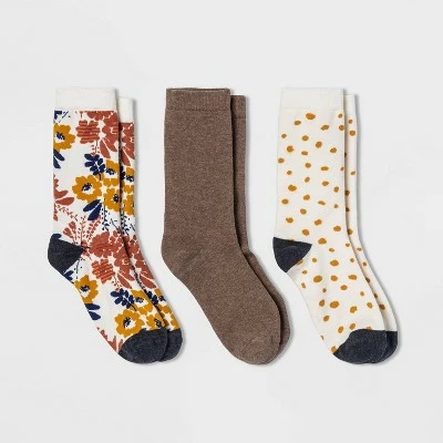 Gift your sock drawer some fun flair with the 3-Pack Crew Socks from A New Dayโข. This pack of women’s socks comes with three pairs โ one with an orange, yellow and navy floral print, one with a yellow dot print and one in solid brown, giving you stylish options to coordinate with a range of looks. They’re made from a soft fabric blend for comfortable wear, with a touch of spandex that lends a stretchy yet stay-put fit. The crew cut allows for easy pairing with many shoe styles, whether you let them peek out from sneakers or low-profile boots or conceal them within higher-cut footwear.
