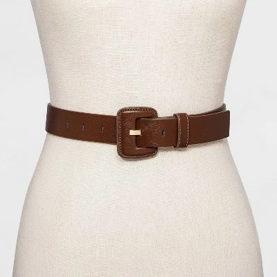 Add a stylish edge to your look with the Covered Buckle Belt with Flat Prong from A New Dayโข. This faux-leather belt is finished in an elegant dark brown hue and sports a complementing square buckle decorated with ornate stitching accents, a matching belt loop and flat prong in gold tone for added interest. The adjustable belt offers you a customized fit with an array of dresses, denim and more.