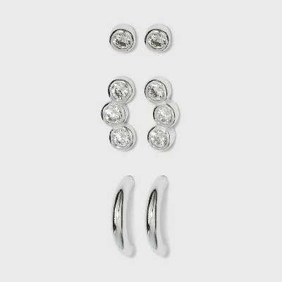 The Sterling Silver Cubic Zirconia Hoop Earring Set from A New Day™ lets you keep it simple and chic with ease. This set includes three pairs of sterling silver earrings in classic styles you’re sure to get plenty of wear out of. A pair of round-cut CZs are set in simple bezel settings that lets their light shine through, and the second pairs of studs triples the shine with three CZs in a graceful arc. The set is rounded out by silver partial hoop earrings in a high-polish finish for a variety of styling options you’ll love.