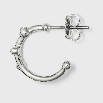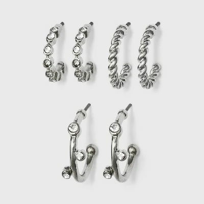 Add a contemporary touch to your looks with the Metal Small Hoop Earring Set from A New Dayโข. This pack of women’s earrings in silver finish is a great addition to any casual or dressy outfit, day or night. It includes three pairs of open-hoop earrings with assorted designs โ there’s one pair with twisted coil design, one accented with clear crystal on the crescent and the third pair with smooth wired design adorned with a few round crystals. Set on post back for easy wear, these nickel-free open-hoop earrings are a great everyday option with an added touch of sparkle.