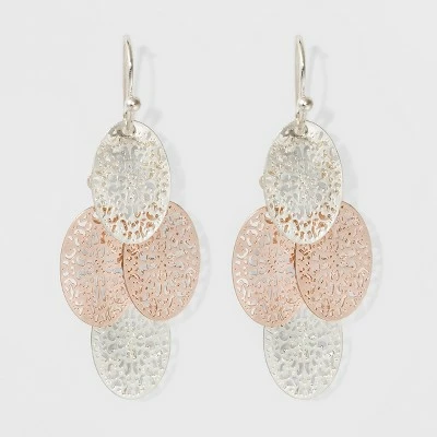 Get in on the mixed-metallics fashion game this season with a pair of Filigree Chandelier Earrings from A New Dayโข. These silver-tone earrings take detail to the next level by pairing silver and rose gold medallions cut with intricate filigree for a look that stands out. Arranged in a classic diamond chandelier with a drop length of 1.5-inches, this pair of silver-toned, fish hook earrings will add a touch of shine to all your favorite outfits.