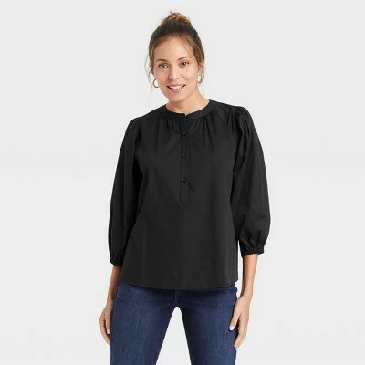 Show up to your next date or office meeting in chic style with this Puff 3/4-Sleeve Blouse from A New Day™. The 3/4-sleeve blouse features a half-button closure for easy wear and a polished finish, along with pleated detailing on the neck and sleeves for a pretty drape. The top has 3/4 puff-sleeves with cuffs for a refined look that’s versatile as well. Simply pair with any style of bottoms to suit a range of occasions.