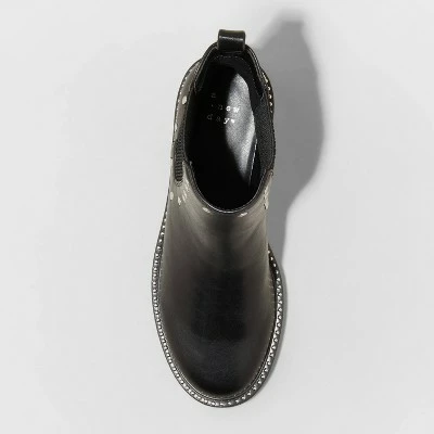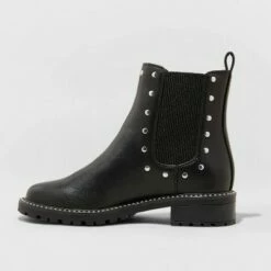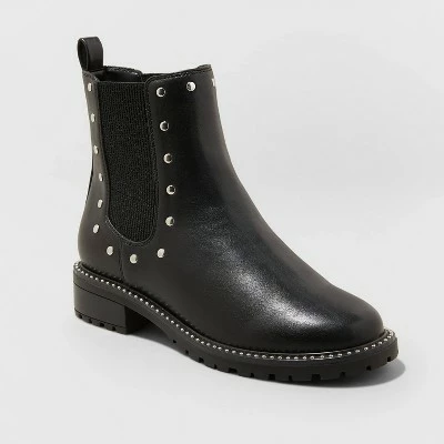 Take your footwear fashion to the next level with Sasha Studded Chelsea Boots from A New Day™. These knee-high boots feature a classic round, closed-toe shape, and they’re designed with a 1.25-inch block heel to add a little lift to your looks. Featuring a faux-leather upper with stud accents for edgy style, these medium-width boots also feature rubber soles for comfy wear. Pair them with skinny jeans and a leather jacket, or with a midi skirt or dress to take on your day with comfortable flair.
