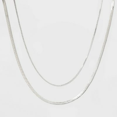 Whether you’re looking to create a simple look or an eye-catching look, this 2-Piece Plated Herringbone and Box Chain Necklace Set from A New Day™ will meet all your styling needs. This silver-tone necklace set includes one plated herringbone and one box chain necklace for versatile styling. Great to wear alone or mix and match with other accessories, this silver-tone necklace set helps you create a stunning look no matter the occasion.