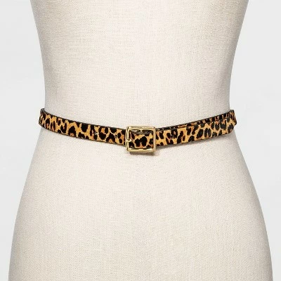 Bring a touch of ferocity to your accessories collection with the Leopard Print Gold Square Buckle Belt from A New Day™. This women’s belt pops with a leopard print for a bold accessory, and faux-hair detailing complements the pattern with equally bold texture. A thin silhouette makes the belt ideal for wearing at the waist, working well with high-waisted bottoms or for creating an on-trend cinched-in look with your favorite dresses, flowy blouses or oversized tees. A square-shaped, gold-tone buckle adds a touch of shine and provides a sleek contrast to the textured belt for a standout accessory that’s sure to quickly become a favorite.