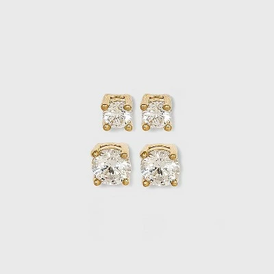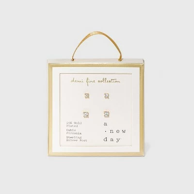 Look effortlessly stylish with the 14K Gold Plated Cubic Zirconia Duo Stud Earrings from A New Dayโข. These charming earrings are made out of 14k gold-plated, nickel-free metal for comfortable and stylish wear. The clear-colored cubic zirconia stones match with everything in your closet, and help add a charming shine and sparkle to your favorite outfits. The post closure helps keep them in place as you go about your day.
