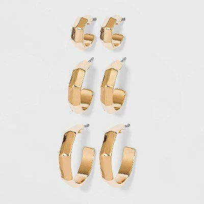 Glam up your look with dimensional texture and shine with the Gold Hammered Textured Hoop Earrings from A New Day™. This set of gold-tone hoop earrings adds shine and offers easy styling with any outfit. It includes three metal hoop earrings with a thick hammered design in varying sizes for edgy texture and on-trend style. These lightweight earrings are comfortable for all-day wear — they have butterfly backs for a secure fit, while the nickel free metal construction suits most skin types. Wear this pair with black dresses and heels or with everyday tee and jeans combo for a stylish boost.