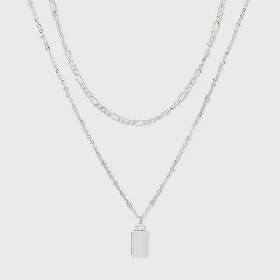 Add some layered interest to your look with this Silver Rectangle Charm Chain Necklace from A New Dayโข. This double layered chain necklace in a silver finish makes a versatile and stylish pick with a range of outfits. The longer chain has small beads at regular intervals along the entire length and suspends a rectangular charm accent for an elegant look. This fashion jewelry accessory fastens with a classic lobster clasp closure for secure and easy wear. Pair with a range of casual ensembles or tailored dresses to enhance your dressing style.