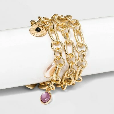 Decorate your wrist for any occasion with the 3-Piece Cabochon and Simulated Pearl Charm Bracelet Set from A New Dayโข. This set of bracelets includes three gold-finish chain bracelets that have the same link size and thickness for a look that’s beautiful whether you wear them all together or one at a time. One bracelet sports cabochon and simulated pearl charms for extra bling. Lobster claw clasps on each bracelet make for easy fastening that stays put throughout your day, and the simple design with gold finish pairs just as well with a little black dress as with a sweater and jeans combo.