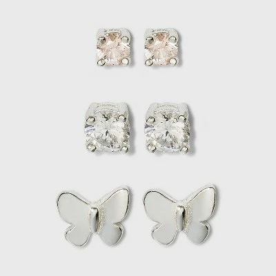 Keep your look light and bright with the Sterling Silver Cubic Zirconia and Butterfly Earring Set from A New Dayโข. This set includes three pairs of sterling silver earrings in classic styles you’re sure to get plenty of wear out of. A pair of simple butterfly silhouettes make for a great casual look, while two other pairs of dainty stud earrings feature round-cut CZs in classic prong settings that let their light shine through for an added dose of shine. Wear pairs separately for a touch of sparkle, or sport them together to amp up the glam factor.