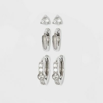 Give your wardrobe a sparkly upgrade with the Sterling Silver Cubic Zirconia Stud and Huggie Hoop Earring Set 3pc from A New Dayโข. This lovely set includes three pairs of earrings, all made out of nickel-free sterling silver. Both stud style earrings, and one of the hoop earrings, feature cubic zirconia details that add the perfect amount of shine and sparkle to your outfit! Plus, the post-clasp helps keep them in place as you go about your day!