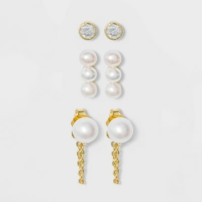 Bring a little everyday glam to your wardrobe with the Faux Pearl and Cubic Zirconia Sterling Silver Earring Set from A New Dayโข. This set includes three pairs of plated sterling silver earrings in a gold tone in classic styles you’re sure to get plenty of wear out of. A pair of round-cut CZs are set in simple bezel settings that let their light shine, a pair of simulated pearl earrings combine white and peach colors for a subtle twist, and another pair of faux pearl earrings shakes things up with a gold-tone chain embellishment. Each pair is set on post earring hardware with butterfly backs for comfortable and secure wear, making it easy to style them together or separately for a range of options you’ll love.