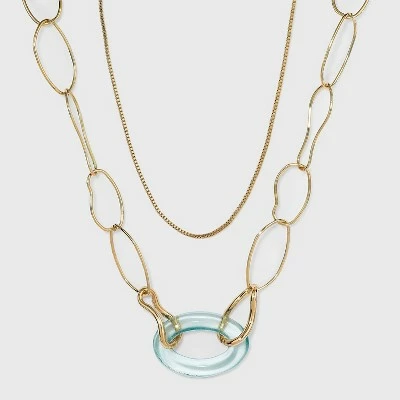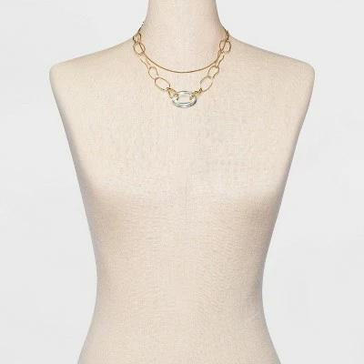 Make a plain outfit pop with textured flair from this Layered Link Chain Necklace from A New Dayโข. The closely linked box chains of the choker necklace complement a lucite chain necklace with large loops of a slightly longer length. The lucite chains end in a clear, oval-shaped pendant for a touch of elegant flair that goes nicely with any dress. It has an adjustable lobster claw clasp so you can find the best fit for your neck, and the gold finish easily pairs with your other gold jewelry.