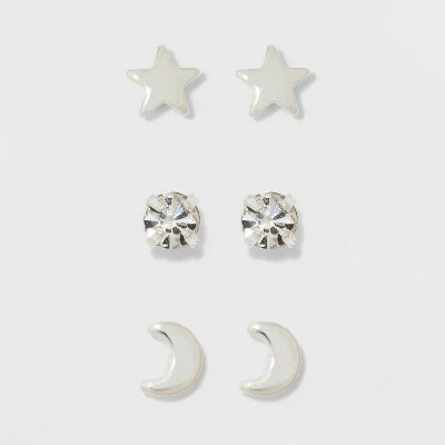 Show off your celestial style with the Star, Moon and Cubic Zirconia Earring Set from A New Dayβ’. Featuring three pairs of dainty studs, this set includes glimmering round-cut CZ, crescent moons and little stars evoking the magic of the night sky. Wear them together or mix and match to your heart’s content!