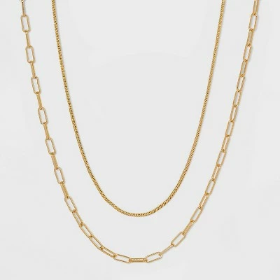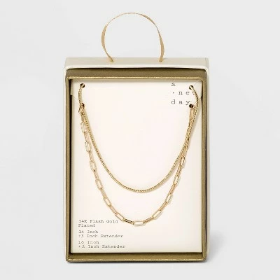 Create lots of glamorous looks pairing your outfits with this Silver Plated Gold Dipped Link Chain Duo Necklace from A New Dayโข. This two necklace pack includes one design with small links and another with long links to help you create a variety of looks. Whether it’s a routine day or a special occasion, these gold dipped necklaces will complement your outfits well. Both the necklaces come with an extender chain to help you adjust the length, and they easily close with a lobster claw clasp closure for a secure fit. You can wear these worn-gold necklaces as a solo piece or pair with similar earrings and bracelets for versatile styling.