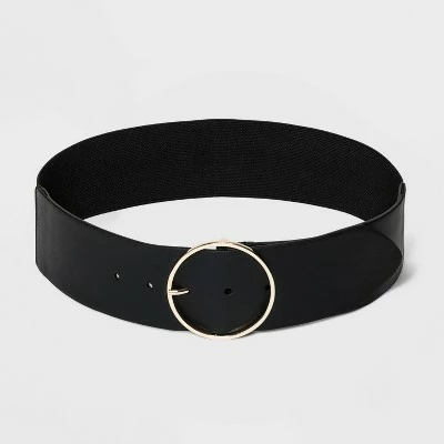 Simple yet chic style is easy to add to your accessories collection with the Wide Belt from A New Day™. This women’s belt has a rich black color that provides the perfect complement to the gold-tone circular buckle, and it’s made from a blend of real and faux-leather for an elevated look you’ll love. A wide silhouette makes the belt ideal for wearing at the waist to create an on-trend, cinched-in look with your favorite dresses or flowy blouses. You can even take an oversized T-shirt up a notch by adding on this belt and pairing with skinny jeans, knee-high boots and a leather jacket. However you wear it, you’ll appreciate the elasticized back that lets the belt move with you for comfy wear.