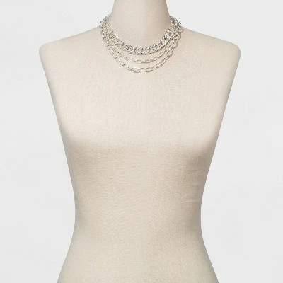 Create a stunning look to finish off tons of different outfits wearing this Multi Row Layered Chain Linked Necklace from A New Day™. This layered necklace features connected chains of varying lengths to bring extra visual appeal, texture and a hint of shine to your outfits. Whether worn alone or mixed and matched with coordinating earrings and bracelets, this choker necklace helps you create a statement style.