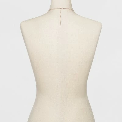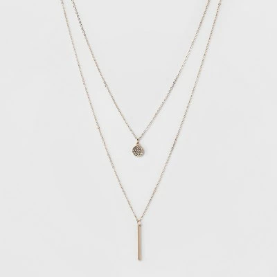 Add a subtle pop of style to your outfits with this Pave Circle and Thin Bar 2-Row Short Necklace from A New Dayโข. This shiny, gold necklace features two lightweight chains of different lengths, each embellished with rhinestones and a simple bar to give you a polished, layered look. With a lobster-claw closure for a sure fit, this dainty design adds a feminine flair to this pendant necklace. Slip it on over a flowy, full-length gown for a chic party-ready look.
