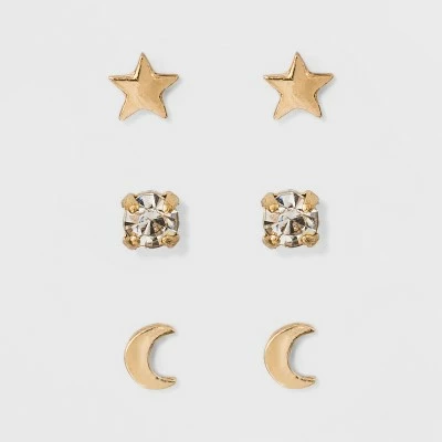 Expand your earring collection with this Moon and Star Earrings Set from A New Dayโข. Two โ or even all three โ of the pairs can be worn at once if you have multiple piercings, or worn one at a time for small, subtle additions to your outfits. These gold stud earrings are versatile enough for any outfit, from shorts and a tank top to your favorite dress.
