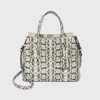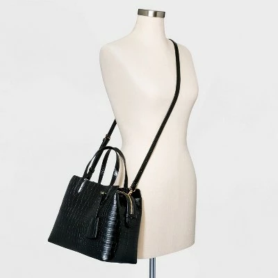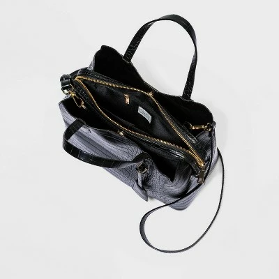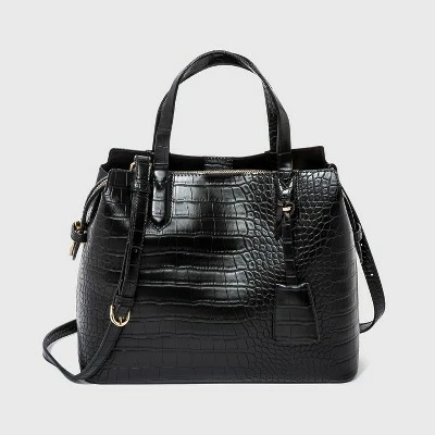 Take your belongings with you when you’re out and about by carrying this Triple Compartment Satchel Handbag from A New Dayโข. This satchel handbag comes with triple compartments along with interior pockets to offer plenty of space for your cosmetics, phone and other belongings. The main compartment has a zipper closure while the other two compartments have snap buttons to help keep the contents secure. Showcasing an alligator skin texture for eye-catching appeal, this black handbag is adorned with a gold-tone zipper closure for a chic look. Plus, you can carry it multiple ways using the double handles and an adjustable strap.