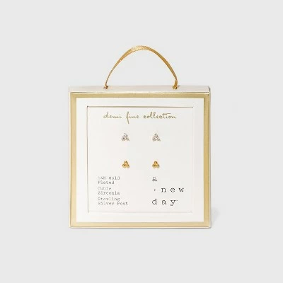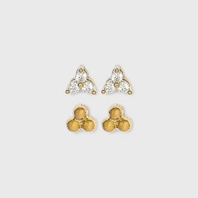 Give your favorite outfits a sparkly upgrade with the 14K Gold Plated Cubic Zirconia Ball Cluster Stud Earring Set from A New Dayโข. This set comes with two pairs of earrings, both with a 14k gold-plated, nickel-free metal structure. The other pair includes a cubic zirconia stone detail that adds an extra shiny charm to your style. A post-clasp closure helps keep these earrings in place as you go about your day in style.