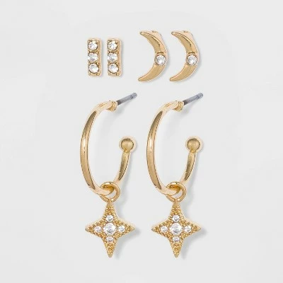 Add a dainty, celestial touch to your jewelry collection with the Three-Pair Cubic Zirconia Earring Set from A New Dayโข. This set includes a pair of bar studs set with three CZ stones, small hoops with celestial charms and a pair of crescent moon earrings to round out the gold-tone earring set. The coordinating styles mean it’s easy to pair them up for multiple lobe piercings, and they also look great solo for the perfect minimalist jewelry vibe.