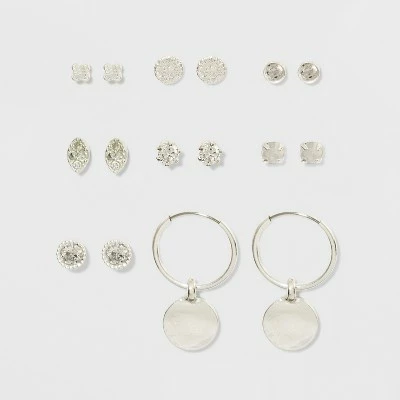 Complete any outfit with the shining addition of a pair of earrings from the Cubic Zirconia Studs and Hoop 8-Pack Multi Earring Set from A New Dayโข. With seven different sparkling stud earrings to choose from, you can go for a single stone for simple glam or go for a more unique look with the teardrop studs. If you want something that stands out a little more, slip on the hoop earrings with disc for fun movement.