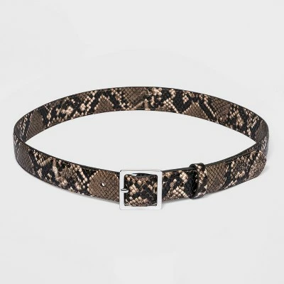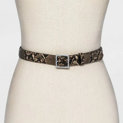 Lend on-trend appeal to your everyday outfits with this Skinny Exotic Snake Belt from A New Day™. This belt in a stylish snakeskin finish makes a go-to styling piece in your accessories collection. It features a silver buckle closure for textured detail and style, and the multiple hole adjustments offer a customized fit to make sure your bottoms stay securely in place. From high-rise jeans to rompers to summer dresses, this belt brings effortless appeal to any outfit you pair it with.